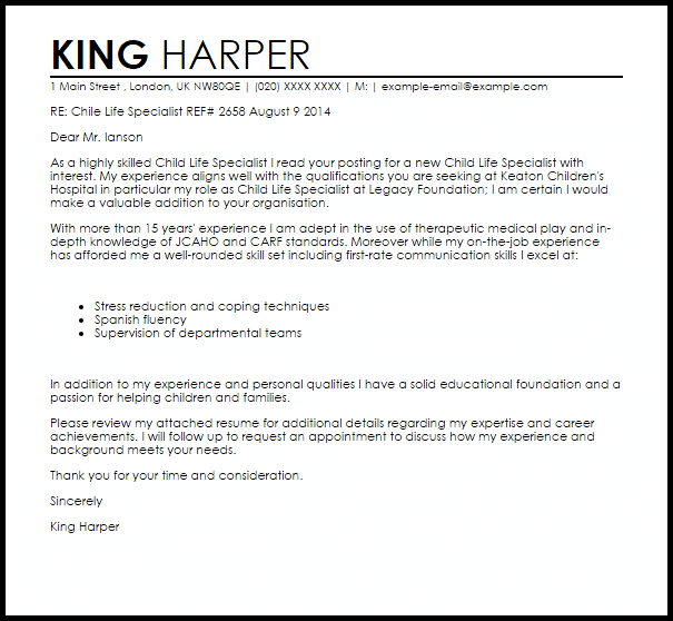 Child Life Specialist Cover Letter Sample | LiveCareer