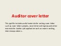 Cover Letter Auditor. Writing a great Auditor cover letter is an important step in your job search journey. Use this auditor cover letter template to build a job-winning cover letter quickly and easily.
